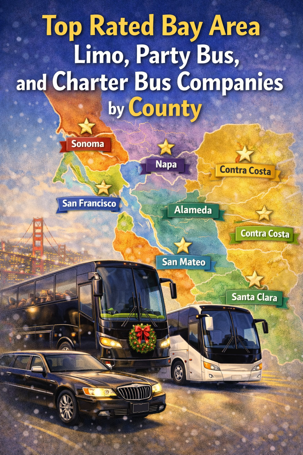 Below we’ve compiled the top five highest-rated limo and bus rental companies in each Bay Area county. We cover all Northern California Bay Area counties from Alameda and Contra Costa to Santa Clara and Sonoma. Each county section includes links to the county page (for example, Sonoma County) and city-specific service pages (for example, San Jose limo service) on BayArea.limo for local services. Referencing county and city pages helps local customers find the right limousine, party bus, or charter bus provider in their area.